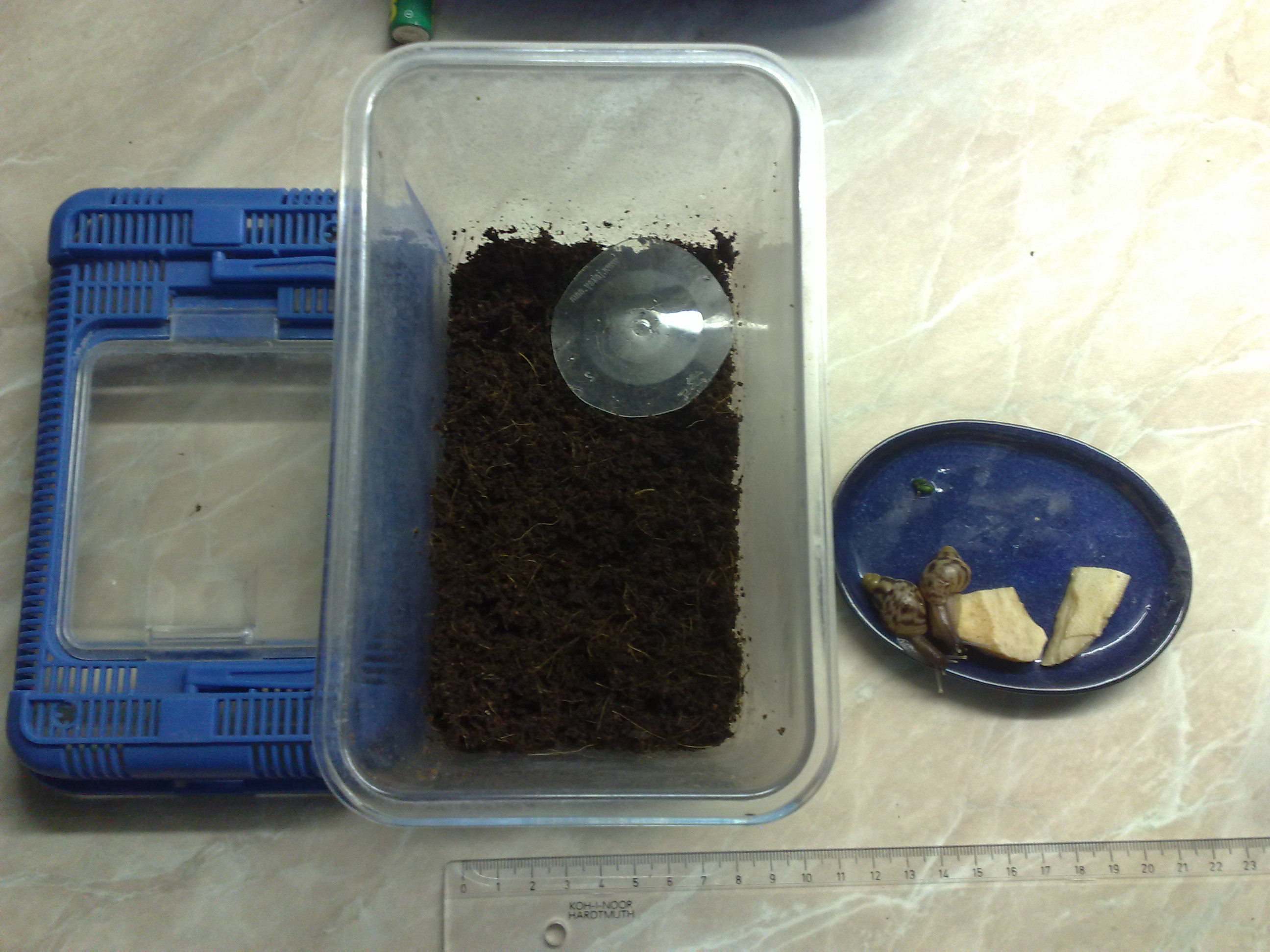 Nejvhodnější terárium pro Achatinu Reticulatu ( Žravou) je 40cm na délku 25cm na šířku a výšku. Terária jsou dost drahá, proto jsem zvolila akvárium, které nestálo víc jak 300kč + krycí sklo s otvory na cirkulaci vzduchu- 100kč a podložka pod akvárium 30kč.